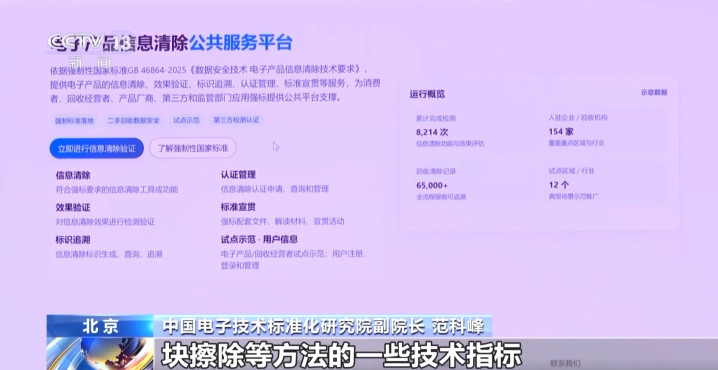 中国电子技术标准化研究院副院长范科峰:明确了数据覆写、块擦除等方法的技术指标,并通过清除认证、标识追溯、日志记录、技术检测等多种方法验证清除效果。
